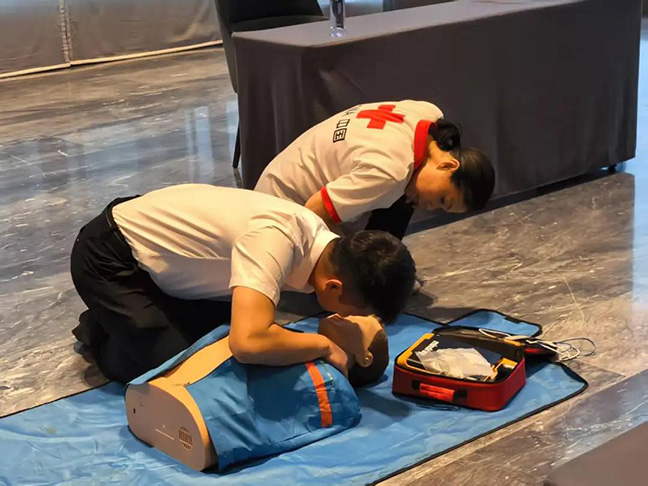 積極探索創(chuàng)新安全管理模式,通過(guò)跨界合作、全員參與,提升安全管理效能。國(guó)投物業(yè)公司與鹽城市亭湖區(qū)紅十字會(huì)攜手,在鹽城先鋒中心項(xiàng)目創(chuàng)新開(kāi)展“消防+急救”雙場(chǎng)景聯(lián)動(dòng)演練?;顒?dòng)特邀紅十字會(huì)專家現(xiàn)場(chǎng)授課,圍繞心肺復(fù)蘇(CPR)、AED 使用、海姆立克急救法等急救技能展開(kāi)詳細(xì)講解與實(shí)操指導(dǎo)。
